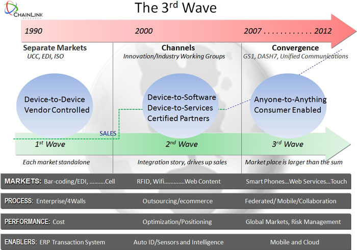 The second wave then addresses the needs of expanded applications and catalyzes the ‘partner network.’ This phase is one where providers seek each other out and create some standards to interoperate within their domain. So certifications for these ‘vendor centric’ environments dominate. Customers like assurances that now the solutions are coming from a group that they will still work with. There generally is a ‘center’ that sees to this assurance. Great examples of this are firms like Motorola on the device-side, Intelligent Insites as a platform provider, and, of course, most successfully Salesforce. com. Standards groups thrive and drive here, as noted above: the GS1s, DASH7s and NFC Forum.