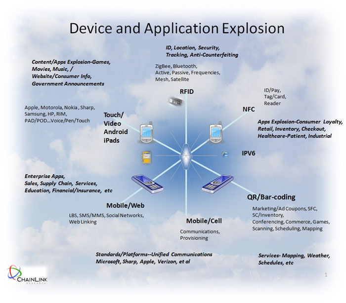 If we look at Figure one, this convergence is in full force. RFID frequencies and standard groups like DASH7 and NFC are developing a device that puts this on your smart phone. Mobile carriers have already featured apps for scanner/bar-coding that link to web content and services. Telepresence /Web Conferencing is on mobile platforms: both smart phones and touch/pad devices. And traditional application providers in the enterprise are porting and developing new apps on the mobile and touch platforms.