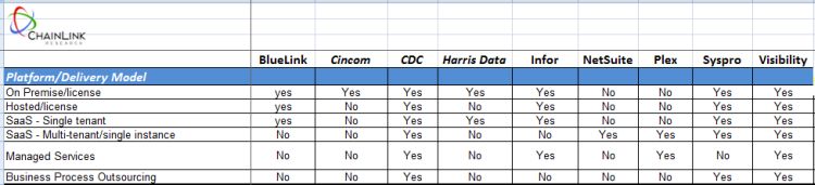 You can see in Table 4, industry focus is clearly important. Take CDC software vs. Visibility as an example. CDC is strong in process areas such as chemical and pharmaceuticals; whereas Visibility’s strength is in Aerospace, Engineering and Construction—very different processes, products, and financial models. Therefore, the software has to look very different. One of the most important elements in selecting a solution is this industry focus. Before you proceed with a provider, you should be clear about their industry expertise.